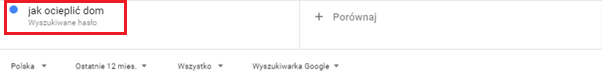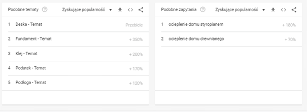 Jak widać na powyższym zestawieniu, największe zainteresowanie ociepleniem domu wykazują osoby zamieszkujące województwo mazowieckie. Nie oznacza to jednak, że w przypadku innych województw ta fraza nie jest wyszukiwana w ogóle. Należy pamiętać, że Google Trends bada wyłącznie trendy w odniesieniu do konkretnego zapytania. Nie oferuje sztywnych danych, dlatego w kwestii doboru słów kluczowych warto posiłkować się innymi narzędziami. Więcej o narzędziach do wyboru słów kluczowych przeczytacie we wpisie o LSI keywords.