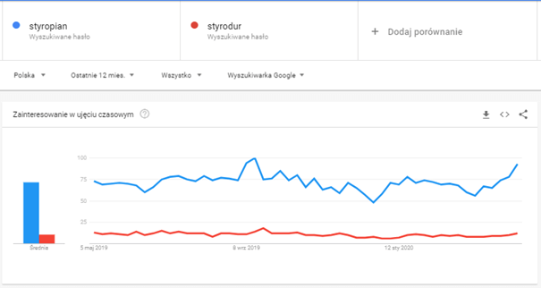 Z powyższego wykresu jasno wynika, że zainteresowanie styropianem w ostatnich dwunastu miesiącach jest znacznie wyższe niż w przypadku styroduru. Nie jest to jednak zaskakujące, wiadome jest to, że styropian należy do znacznie bardziej rozpoznawalnych produktów. Widać jednak, że trendy w przypadku obu fraz są podobne. W podobnych okresach zainteresowanie wskazanymi frazami wzrasta i maleje.