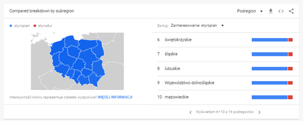 Wynika z niego, że styropian cieszy się największą popularnością w województwie świętokrzyskim, natomiast styrodur jest najczęściej wyszukiwany w lubelskim. W przypadku obu produktów ich popularność nie różni się jednak mocno z podziałem na województwa.