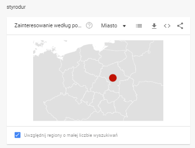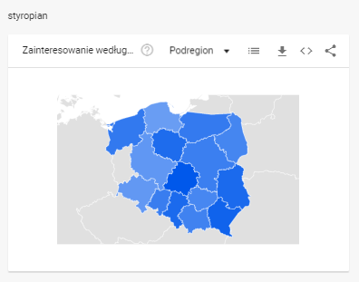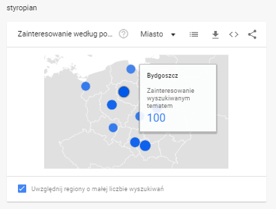 Mamy do czynienia z danymi przedstawiającymi zainteresowanie styropianem według regionu i tak samo, jak w poprzednim przypadku, możemy zmienić obszar zainteresowania na konkretne miasta.