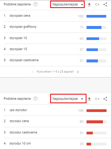Domyślne ustawienia przedstawiają zapytania, które w ostatnim czasie zyskują na popularności. Warto jednak zdawać sobie sprawę, że dane możemy także posortować po najpopularniejszych.