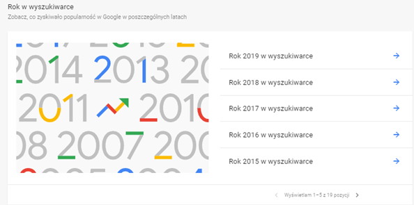Rok w wyszukiwarce to ciekawa sekcja, w której otrzymujemy roczne zestawienie ze słowami kluczowymi, które w danych latach najbardziej zyskiwały na popularności.