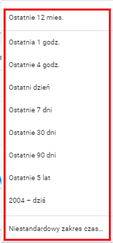 W kwestii wyboru analizowanego okresu nie musimy posiłkować się zakresami oferowanymi przez Google. Na samym dole dostępna jest opcja Niestandardowy zakres czasu, w której to możemy samodzielnie wybrać interesujący nas przedział czasowy.