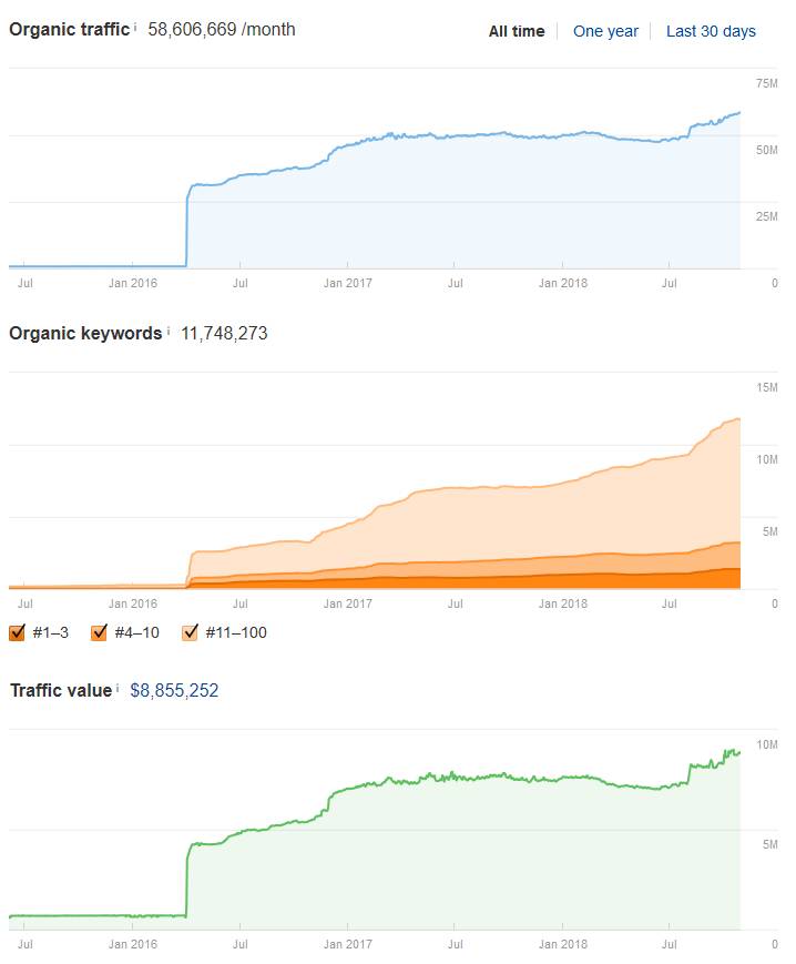 Doskonale obrazuje to wspomniane wyżej Allegro, które w ciągu ostatnich kilku miesięcy zyskało szacunkowo niemal 15 milionów ruchu. Mówimy tutaj o estymacji narzędziem Ahrefs, które monitoruje wyniki wyszukiwania dla kilkudziesięciu milionów słów kluczowych oraz w oparciu o pozycje i obecność dla danych zapytań, szacuje ruch oraz jego wartość dla wybranej domeny.