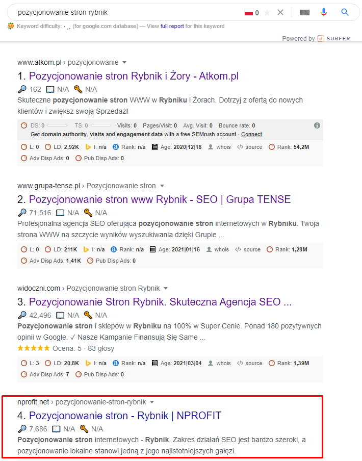 3 na 4 pierwsze pozycje dla frazy pozycjonowanie stron Rybnik zajmują agencje ogólnopolskie, posiadające swoją siedzibę w Poznaniu.