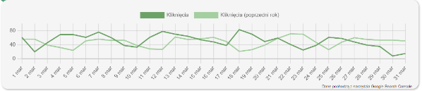 Wykres kliknięć wskazuje ilość kliknięć w raportowanym miesiącu w porównaniu do poprzedniego roku (jeśli takie dane były zliczane).