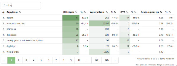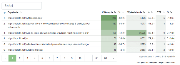 Powyższe dwie tabelki wskazują, przez jakie frazy użytkownicy trafili na Państwa stronę oraz analogicznie przez które adresy URL. Obok nich pojawia się informacja ile razy nastąpiło kliknięcie oraz wyświetlenie (słowa kluczowego lub adresu URL)