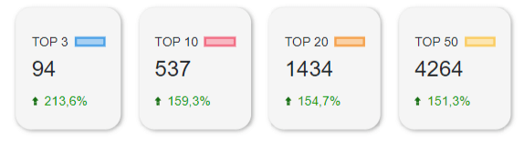 Dane wskazują liczbę fraz, na które pojawia się Państwa strona w zakresie TOP3, TOP10, TOP20 oraz TOP50, dodatkowo oznaczone jest porównanie liczby fraz rok do roku. Poniżej znajduje się analogiczny wykres wskazujący widoczność w dłuższym zakresie czasu.
