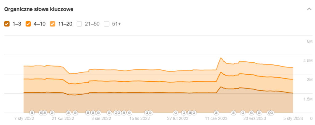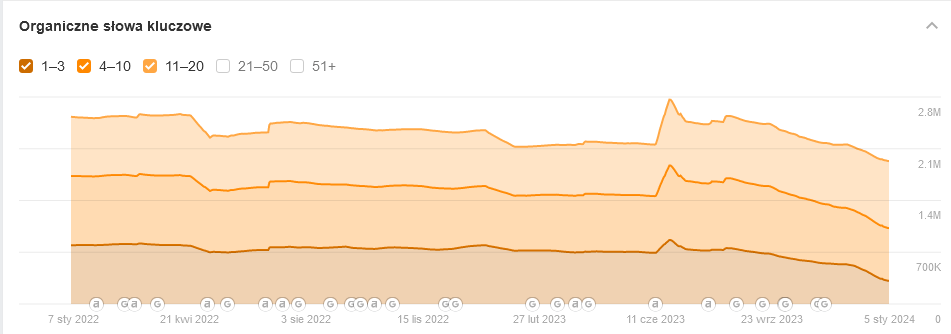 Oczywiście w powyższym przypadku trudno jest mówić o złej sytuacji. Niemniej jednak, warto obserwować rozwój wydarzeń. Domena ta buduje swoją obecność na rynku od niedawna i chwilowe korekty widoczności nie muszą rzutować na długofalowy trend. Spadek fraz w TOP 3 z poziomu około 180 tys. do niecałych 100 tys. jest jednak wart odnotowania.
