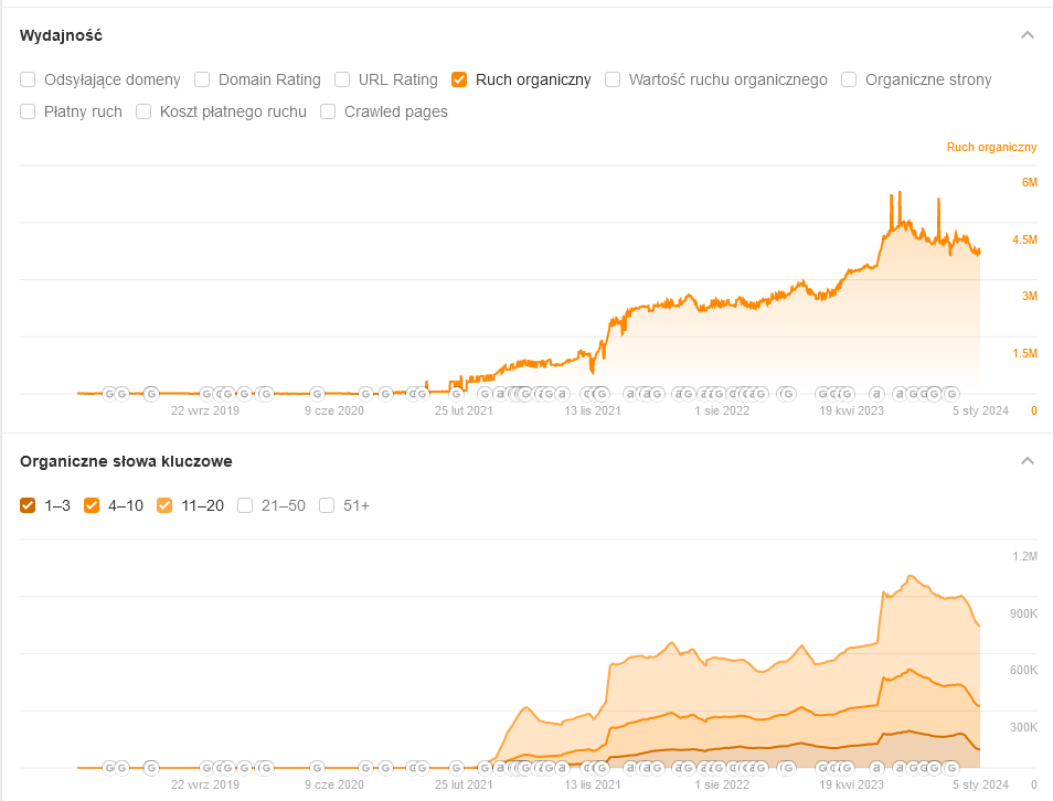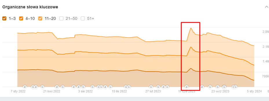 Zwłaszcza jeżeli uwzględnimy fakt, że w czerwcu 2023 narzędzie Ahrefs znacznie zwiększyło liczbę monitorowanych słów kluczowych, co skutkowało skokowym wzrostem widoczności.