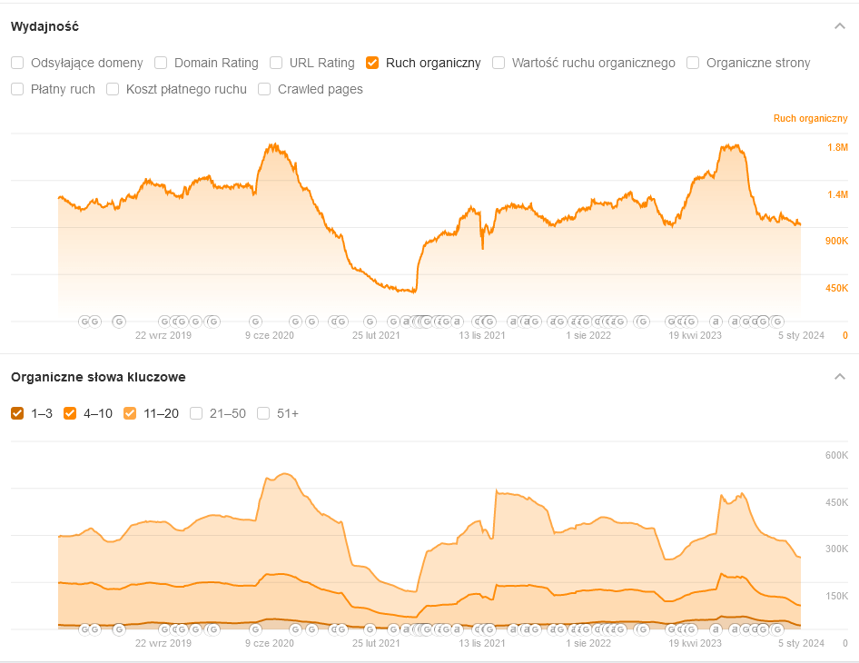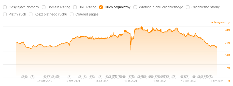 Według Ahrefs, mówimy tutaj o spadku z poziomu około 27 milionów miesięcznie do poziomu około 16,5 miliona. Mamy więc do czynienia z różnicą na poziomie 10 milionów ruchu miesięcznie.