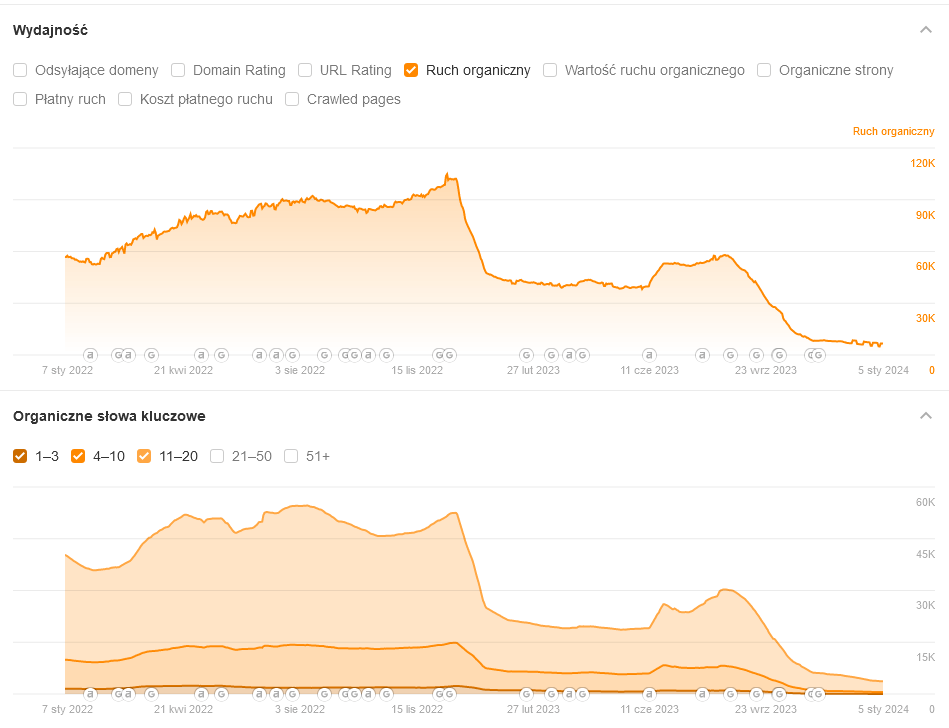 Oczywiście trzeba pamiętać, że są to tylko estymacje niezależnego narzędzia i nie muszą w pełni odzwierciedlać rzeczywistych spadków ruchu. Niemniej jednak, z wszystkich dostępnych narzędzi, które umożliwiają prowadzenie analiz pod tym kątem, to właśnie Ahrefs dostarcza możliwie najbardziej zbliżone dane do tych rzeczywistych.