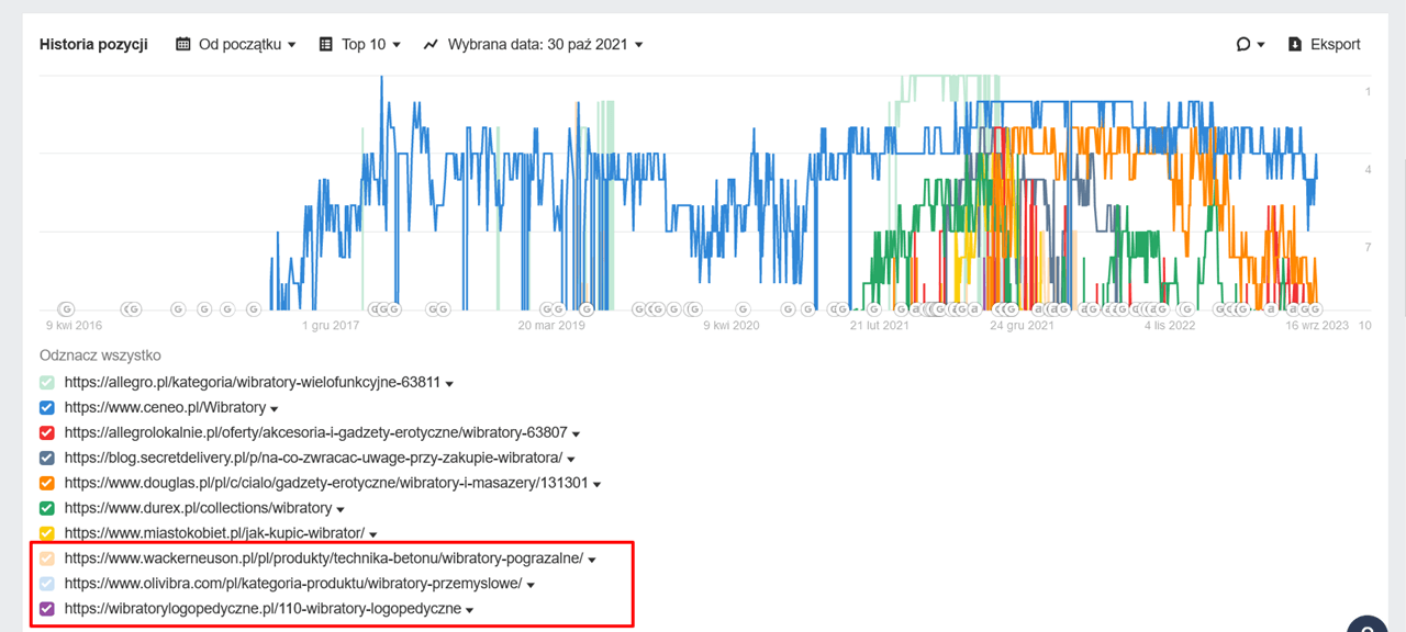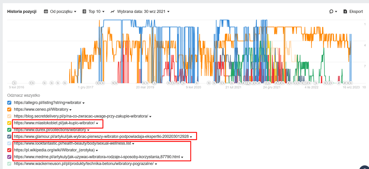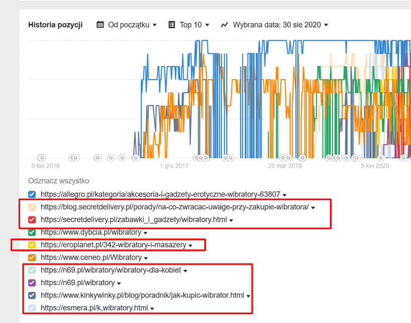 Dobrym przykładem będzie fraza wibratory, gdzie w sierpniu 2020 roku w TOP 10 znajdowały się głównie typowe sklepy erotyczne (erotyka jako wiodący asortyment):
