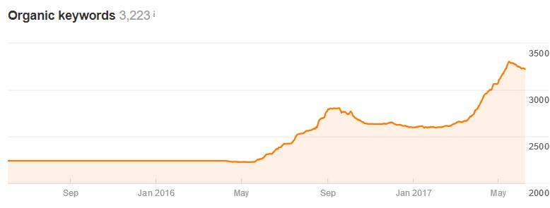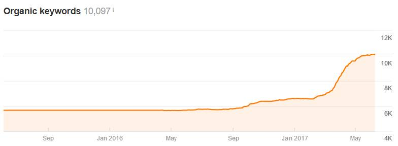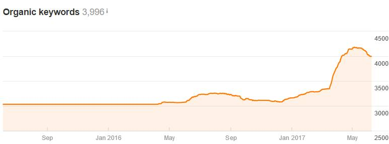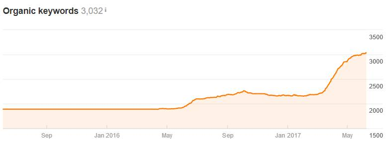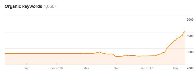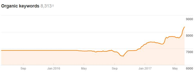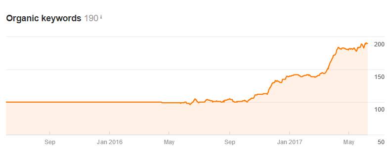 Żeby jednak pozycjonowanie długiego ogona było możliwe, konieczne jest posiadanie unikalnych treści oraz stałe ich rozwijanie. Google jest wyszukiwarką treści, dlatego chcąc wyświetlać się wysoko, musimy o nie zadbać. Równie ważna jak sama unikalność, jest również optymalizacja tych treści pod kątem wyszukiwarek. W większości przypadków opłaca się powierzyć tworzenie treści osobie specjalizującej się w tym. Taka osoba poprzedzi proces pisania dokładnym badaniem potencjału słów kluczowych. Efektem takiej pracy jest widoczność produktu czy strony kategorii na kilkadziesiąt, a nawet kilkaset różnych słów kluczowych. Poniżej przedstawiamy wykres narzędzia Ahrefs przedstawiający wzrost widoczności jednej podkategorii, która została przez nas zoptymalizowana: