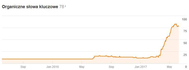 Jak widzimy na powyższym wykresie, podstrona przed optymalizacją wyświetlała się na około 20 słów kluczowych, a aktualnie dla prawie 80 różnych fraz. Stała się również źródłem ruchu i sprzedaży dla naszego klienta.