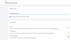 - Ostatnim krokiem jest wpisanie maila bądź maili użytkowników, którym chcesz przydzielić konto. Ważną częścią są również opcje do wyboru, u dołu strony. Tam, możesz wybrać, jakie uprawnienia ma mieć osoba, z którą chcesz współdzielić konto. Czy ma mieć ona pełen wgląd do wszystkich funkcji, czy tylko do części z nich.