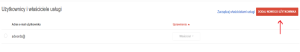 W kolejnym kroku, na ekranie pokażą się użytkownicy/właściciele usługi. Aktualnie znajduje się tam tylko Twój adres e-mail oraz zaznaczone „uprawnienia” jako Właściciel. Aby przydzielić konto drugiej osobie, wybierz, w prawym górnym rogu, czerwony przycisk „Dodaj nowego użytkownika”