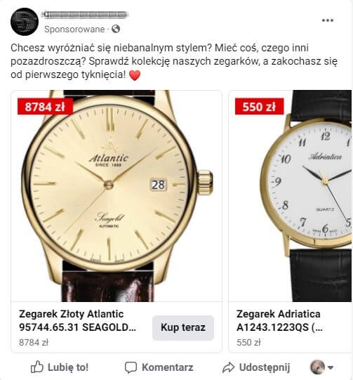Pojawia się możliwość używania emotikon, które przyciągają wzrok i nadają komunikatowi barw. Ponadto na Facebook’u mamy możliwość wyboru kreacji, która najbardziej będzie nam odpowiadać: klasyczny post, katalog produktowy lub kolekcja. O ile opcję pierwszą trzeba będzie stworzyć od zera, o tyle kolejne dwie będą wypełniać swoje karty automatycznie przy pomocy asortymentu Twojego sklepu. Twoją rolą będzie tutaj stworzenie tekstu reklamowego, który przyciągnie jak najwięcej par oczu!