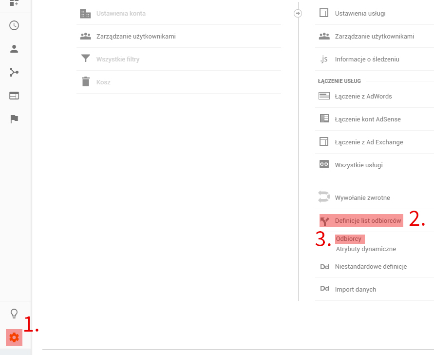 W tym celu na koncie Analytics przechodzimy do zakładki (1) Administracja -> Kolumna Usługa -> (2) Definicje listy odbiorców -> (3) Odbiorcy.