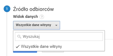 W pierwszym kroku wybieramy źródło danych. W tym wypadku będzie to aktualny widok kampanii. Jeżeli posiadasz różne widoki danych, wybierz właściwy widok, na podstawie którego chcesz utworzyć listę remarketingową.