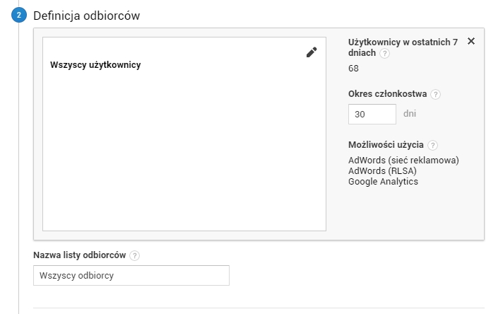 Kolejnym krokiem będzie właściwa definicja grupy odbiorców. W tym korku skupimy się na podstawowej liście remarketingowej, skupiającej wszystkich użytkowników witryny. W tym celu z podanej listy, wybieramy opcję „Wszyscy użytkownicy”. Następnie wybieramy okres członkostwa w liście (okres po jakim dany użytkownik zostanie usunięty z listy, jeżeli ponownie nie odwiedzi strony). Ostatnim krokiem jest podanie nazwy listy. W naszym wypadku, będzie to „Wszyscy odbiorcy” (choć nazwa ta może być dowolna).