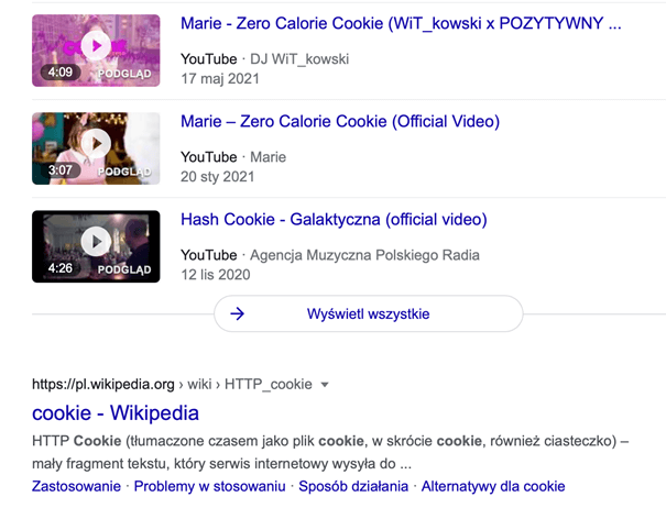 Bez dodatkowych LSI Google wyświetla wyszukiwania, które w szerszym kontekście odpowiadają na „cookie”: