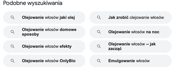 Skorzystanie z wyszukiwarki jest najprostszym sposobem, żeby poznać pojęcia powiązane semantycznie. Sugestie poniżej są odpowiedzią na frazę olejowanie włosów: