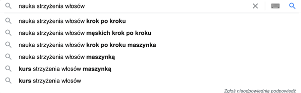 Jednak, tak samo jak w przypadku każdej innej analizy, przy ustalaniu keywordsów nie należy wybierać fraz bezrefleksyjnie. Kurs strzyżenia włosów jest bardzo dobrą frazą, spełniająca założenia LSI, ale nie sprawdzi się, jeśli prowadzimy sklep z maszynkami do włosów, przeznaczonych do domowego strzyżenia. Cztery pierwsze propozycje  trafniej odpowiadają frazie głównej.