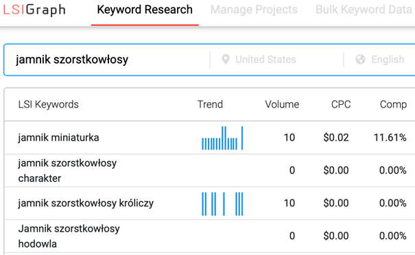 Kolejną propozycją jest lsigraph.com – narzędzie to „generuje słowa kluczowe LSI, które kocha Google”. To oficjalne hasło, które dużo mówi o sile LSI, choć według niektórych źródeł rola słów powiązanych kontekstowo jest przeceniana – w dużej mierze ze względu na swoje ograniczenia.