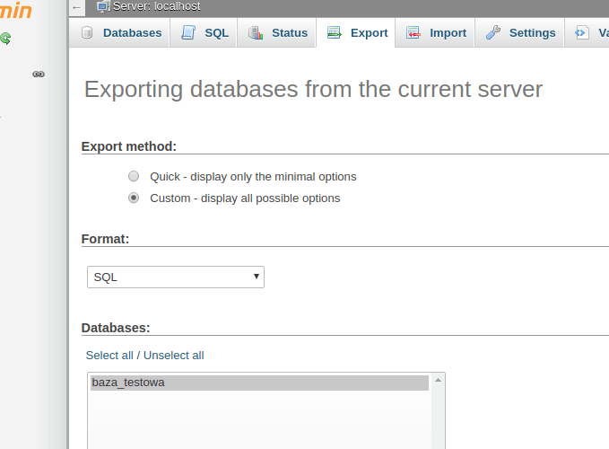 Po zalogowaniu się do panelu phpMyAdmin (najczęściej adres to: domena.pl/phpmyadmin) wybieramy zakładkę “Eksport”. Następnie wybieramy metodę “Custom” i klikamy na bazę danych, której kopię chcemy zrobić. Na koniec wystarczy na samym dole kliknąć “Go”, a plik bazy danych zostanie pobrany na nasz dysk.