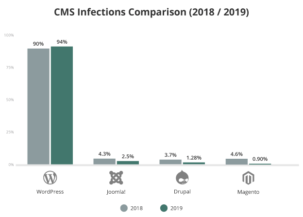 Bez wątpienia WordPress jest naszym ulubionym Systemem Zarządzania Treścią (CMS). Spośród wszystkich stron internetowych posiadających wspomniany CMS – to właśnie WordPress jest najczęściej wybieranym, bo aż w ponad 63% przypadków (według oficjalnych danych od W3techs). Niestety z uwagi na swoją popularność, jest on również najczęściej atakowanym. Z raportu od Sucuri z roku 2019, wynika, że ze wszystkich zainfekowanych stron, które posiadały system CMS, aż w 94% przypadków był to WordPress.