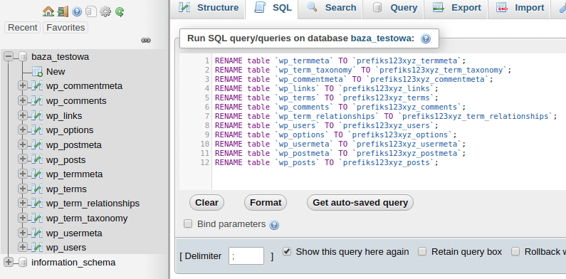 Wcześniej oczywiście trzeba zmodyfikować to polecenie zgodnie z wybranym przez siebie prefiksem tabel. W naszym przypadku będzie wyglądać tak: