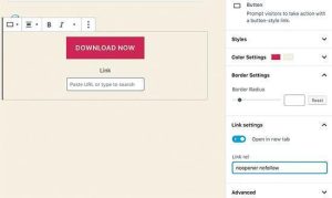Jak widać, w edytorze blokowym pojawi się możliwość ręcznego dodawania atrybutów rel=”” w naszych adresach URL, czy też np. ustawienie atrybutu target=”_blank” poprzez przestawienie przełącznika.