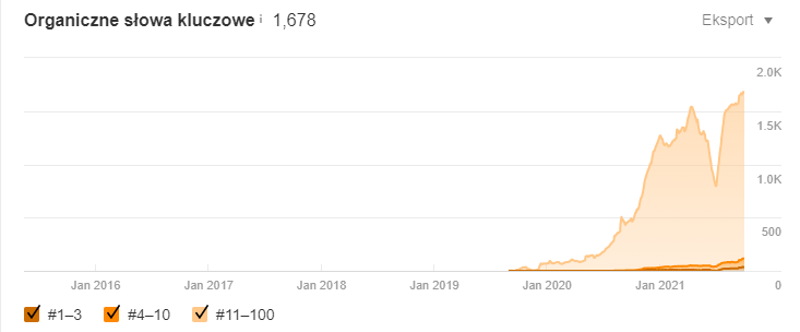 Szczególnie dynamiczny wzrost widoczności zauważalny jest na przełomie czerwca 2021 (zwłaszcza w kontekście słów kluczowych w TOP 3 i TOP 10), kiedy nasza agencja przejęła kontrolę nad wdrażaniem zaleceń optymalizacyjnych.