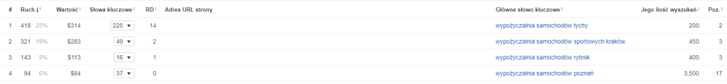 Dzięki budowaniu zapleczy wspierających udało nam się pozyskać odnośniki z dużych serwisów motoryzacyjnych, jak np. motofakty.pl, większych portali branżowych czy szkół jazdy. Jak widać na poniższym zrzucie ekranu, liczba pozyskiwanych odnośników jest proporcjonalna do estymowanego ruchu z bezpłatnych wyników wyszukiwania: